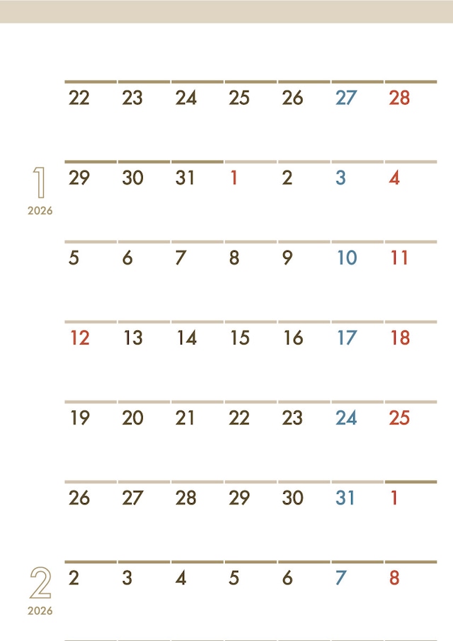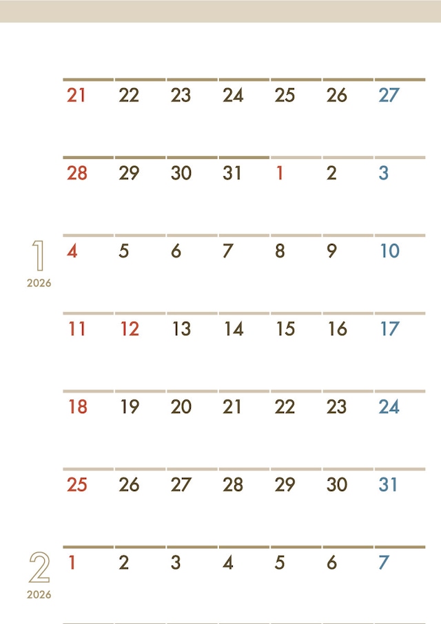 月毎に区切れることなく、365日、日付がつながったカレンダーです。 2026年カレンダー シンプルデザイン【 日曜始まり 】 PDF形式|A3|7ページ ● ご自宅のプリンターやコンビニの印刷機などで印刷してご使用ください。 ● データ上はA3サイズですが、用紙に合わせたサイズで印刷していただけます。 ● デジタルプランナーでもご利用いただけます。 ※ なお本データのご利用は個人利用に限ります。 データの複製や加工、第三者への転送・再配布は一切禁止です。 よろしくお願いいたします。