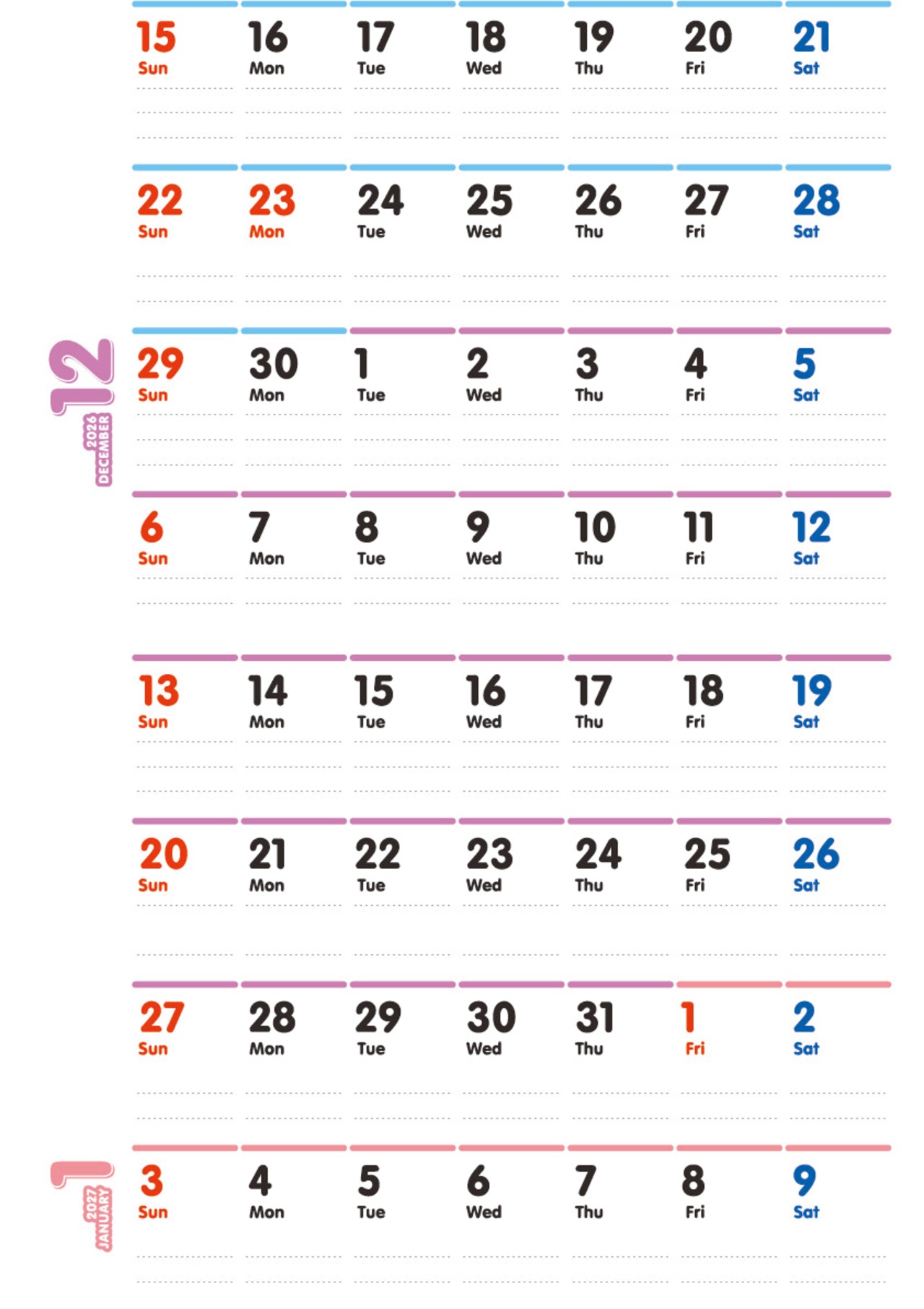 月毎に区切れることなく、365日、日付がつながったカレンダーです。